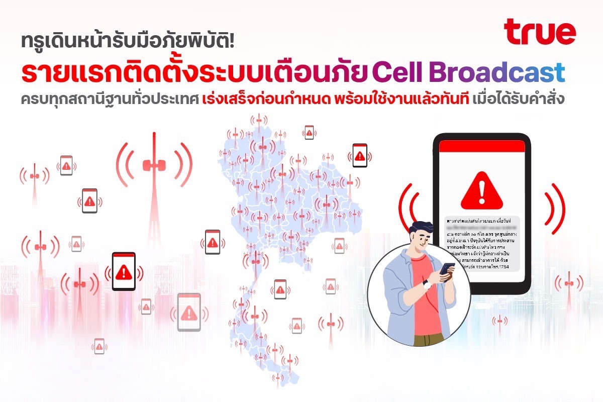 ทรู เดินหน้ารับมือภัยพิบัติ! รายแรกติดตั้งระบบเตือนภัย Cell Broadcast ครบทุกสถานีฐานทั่วประเทศ เร่งเสร็จก่อนกำหนด พร้อมใช้งานแล้วทันทีเมื่อได้รับคำสั่ง แจ้งเตือนฉุกเฉินรวดเร็ว ส่งเสียง-ข้อความขึ้นหน้าจอทันที รองรับ 5 ภาษา ไม่ต้องโหลดแอป