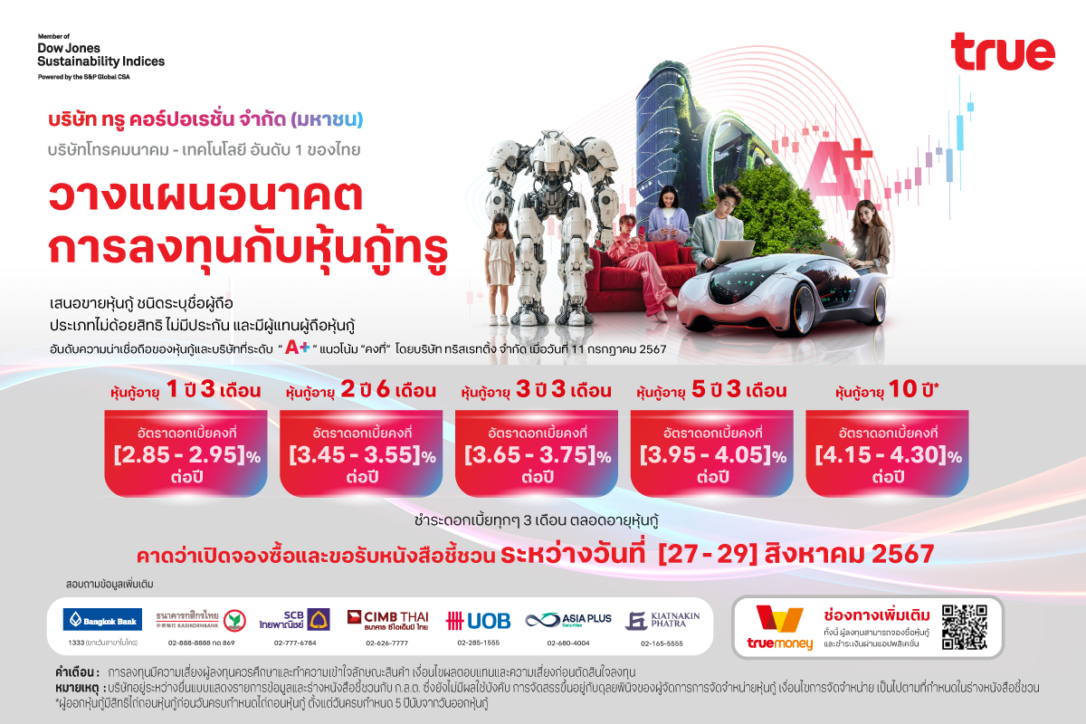 โอกาสลงทุนใน “ทรู คอร์ปอเรชั่น” กับหุ้นกู้ชุดใหม่ ดอกเบี้ย [2.85 – 4.30]% ต่อปี ยืนหยัดความน่าเชื่อถือระดับ “A+” คาดเปิดให้จองซื้อ 27 – 29 สิงหาคม 2567