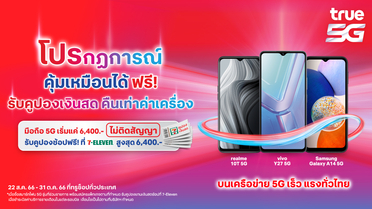 คุ้มเกินคาด … เมื่อซื้อสมาร์ทโฟน 5G ที่ทรูและดีแทค เหมือนได้ฟรี เลือกได้ตามใจ คูปองแทนเงินสด คืนค่าเครื่องรวมสูงสุด 6,400 บาท หรือเลือกรับสมาร์ทโฟนสเปกเทพ True 5G มูลค่า 6,599 บาท ฟรี! รีบเลย ! ตั้งแต่วันนี้ – 31 ต.ค. 66