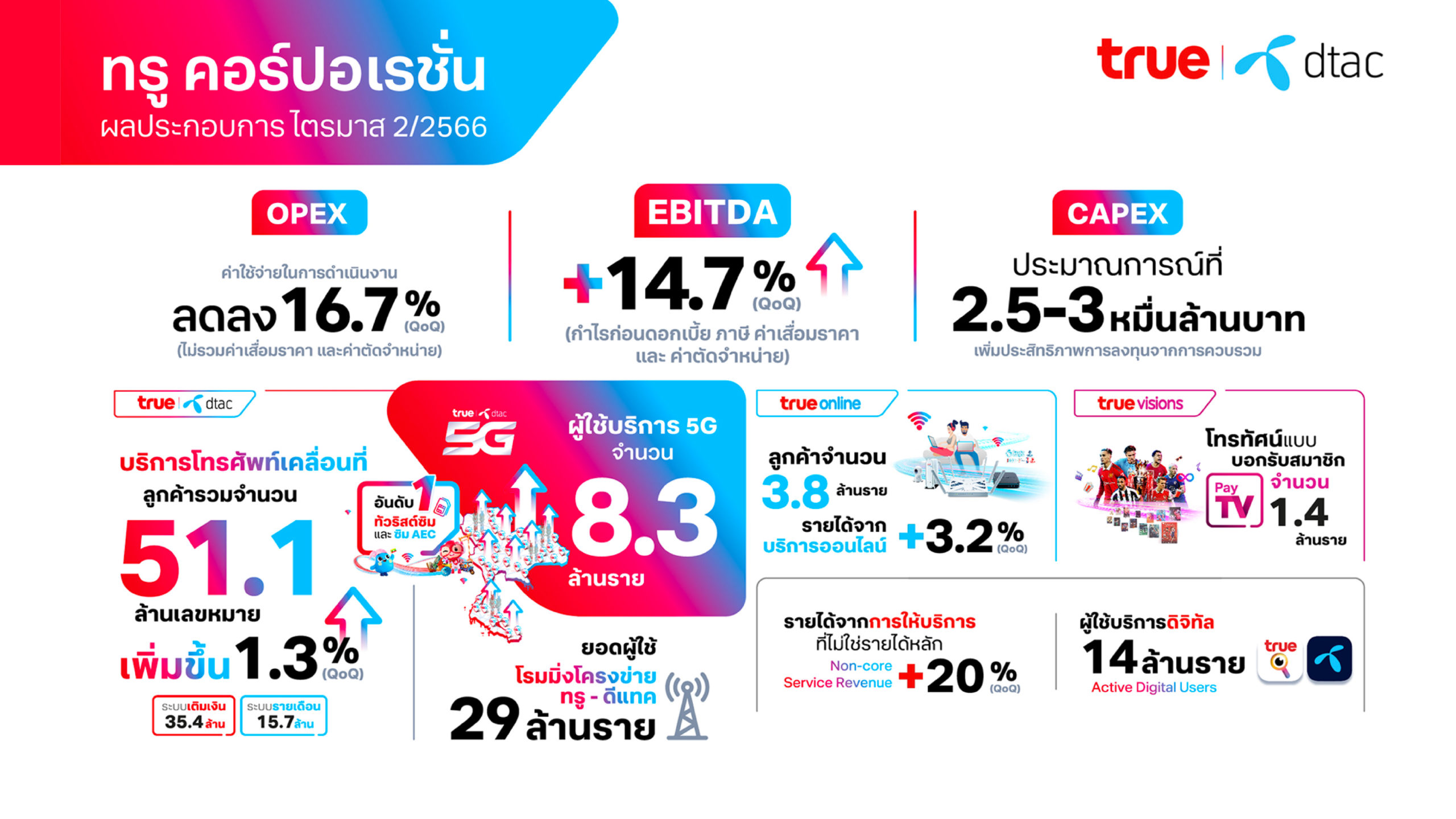 ทรู คอร์ปอเรชั่น เผยไตรมาส 2/2566 รับรู้ผลประโยชน์จากการผสานพลังระยะสั้นส่งผลรายได้ดีขึ้น พร้อมมาตรการเพิ่มประสิทธิภาพดัน EBITDA เติบโต