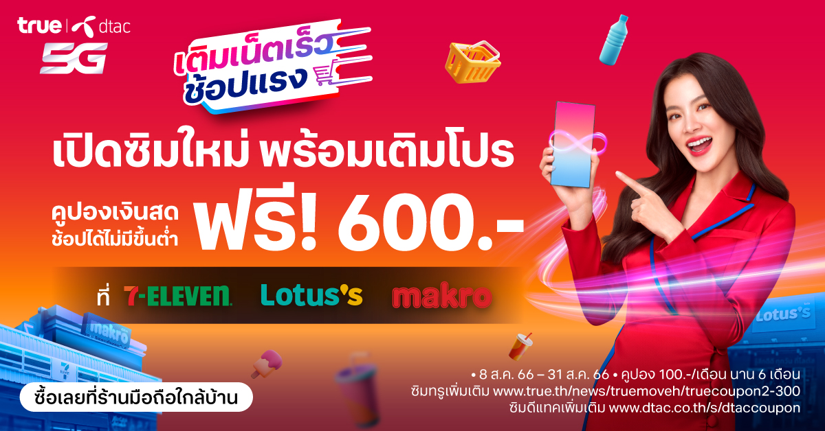 ดีต่อใจ ใครก็อยากได้!! ทรู ดีแทค Better Together รวมกันแล้วได้มากกว่าเดิม ครั้งแรกของลูกค้าเติมเงินทรูและดีแทค รับคูปองเงินสด 600 บาท นำไปช้อปคุ้มสุดๆ เพียงเปิดซิมใหม่ พร้อมสมัครแพ็กเน็ต วันนี้ถึง สิ้นเดือน ส.ค.66