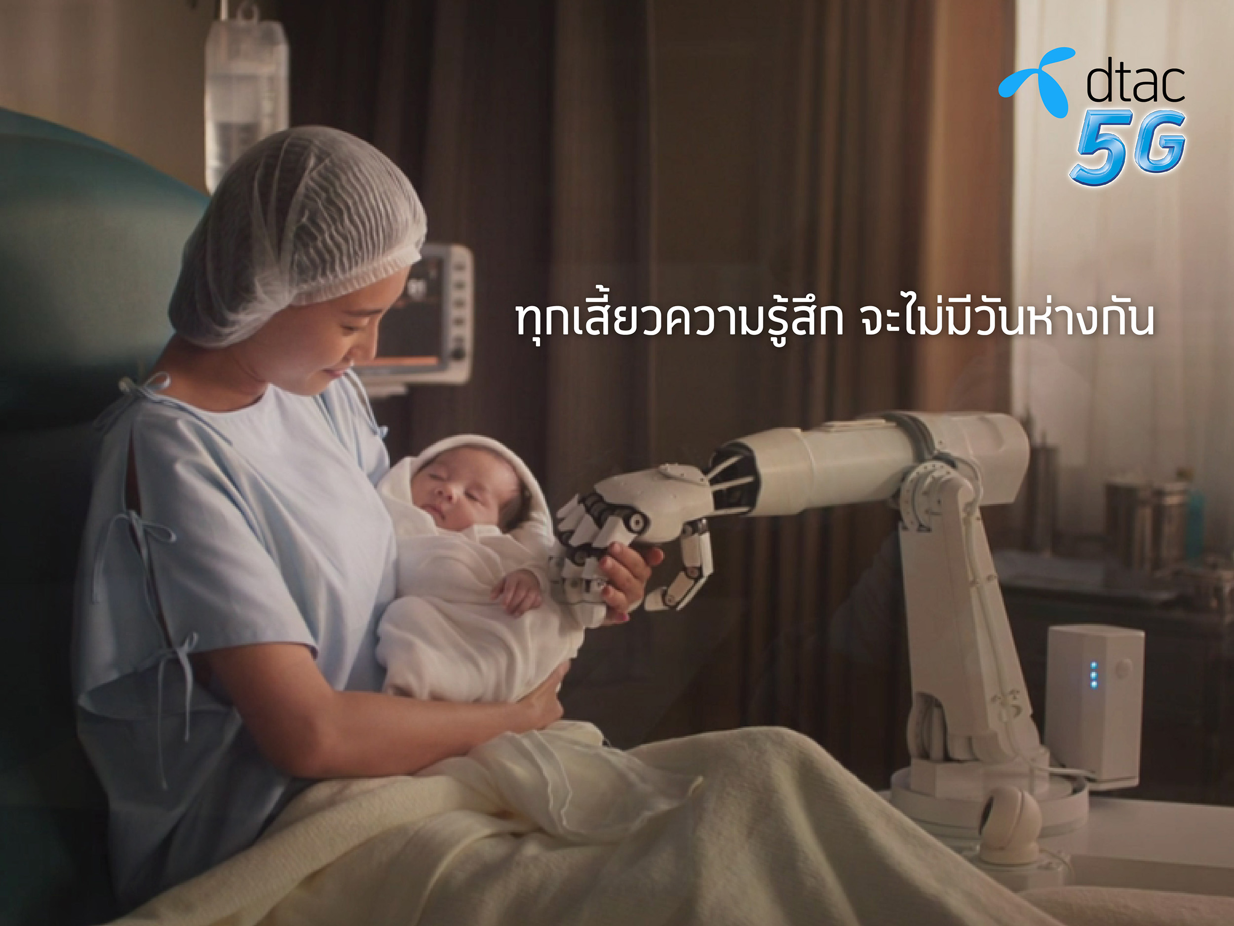 ล่าสุด ดีแทคผุดไอเดียโฆษณาทำหนัง 5G ให้ลูกค้าได้เข้าใจง่าย บอกเล่าไม่ว่าเทคโนโลยีจะไฮเทคแค่ไหนก็ต้องจับต้องได้และมีความเป็นมนุษย์ โดยใช้ความรักความห่วงใยถึงคนที่รัก และอยู่ร่วมกันในครอบครัวมาเป็นจุดร่วมความรู้สึก ด้วยการนำเสนอผ่านเรื่องราวจำลองเทคโนโลยีล้ำยุคและคู่หนุ่มสาวที่เริ่มต้นครอบครัว รวมทั้งสัญญาว่าจะอยู่พร้อมหน้าวันที่ลูกเกิด แต่ด้วยหน้าที่และสถานการณ์ทำให้อยู่ห่างไกลคนละประเทศและกลับมาไม่ทันในวันที่ภรรยาคลอด ดังนั้น เทคโนโลยี 5G ผ่านการจำลองของ Sensory Robotic Arm จึงมาเชื่อมต่อทุกเสี้ยวความรู้สึกจากพ่อที่อยู่ห่างไกลและลูกที่เพิ่งเกิดให้เสมือนได้สัมผัสมือของลูกน้อย โดยมีแม่ดูแลอยู่เคียงข้างด้วยความรักและอยู่ด้วยกันพร้อมหน้า