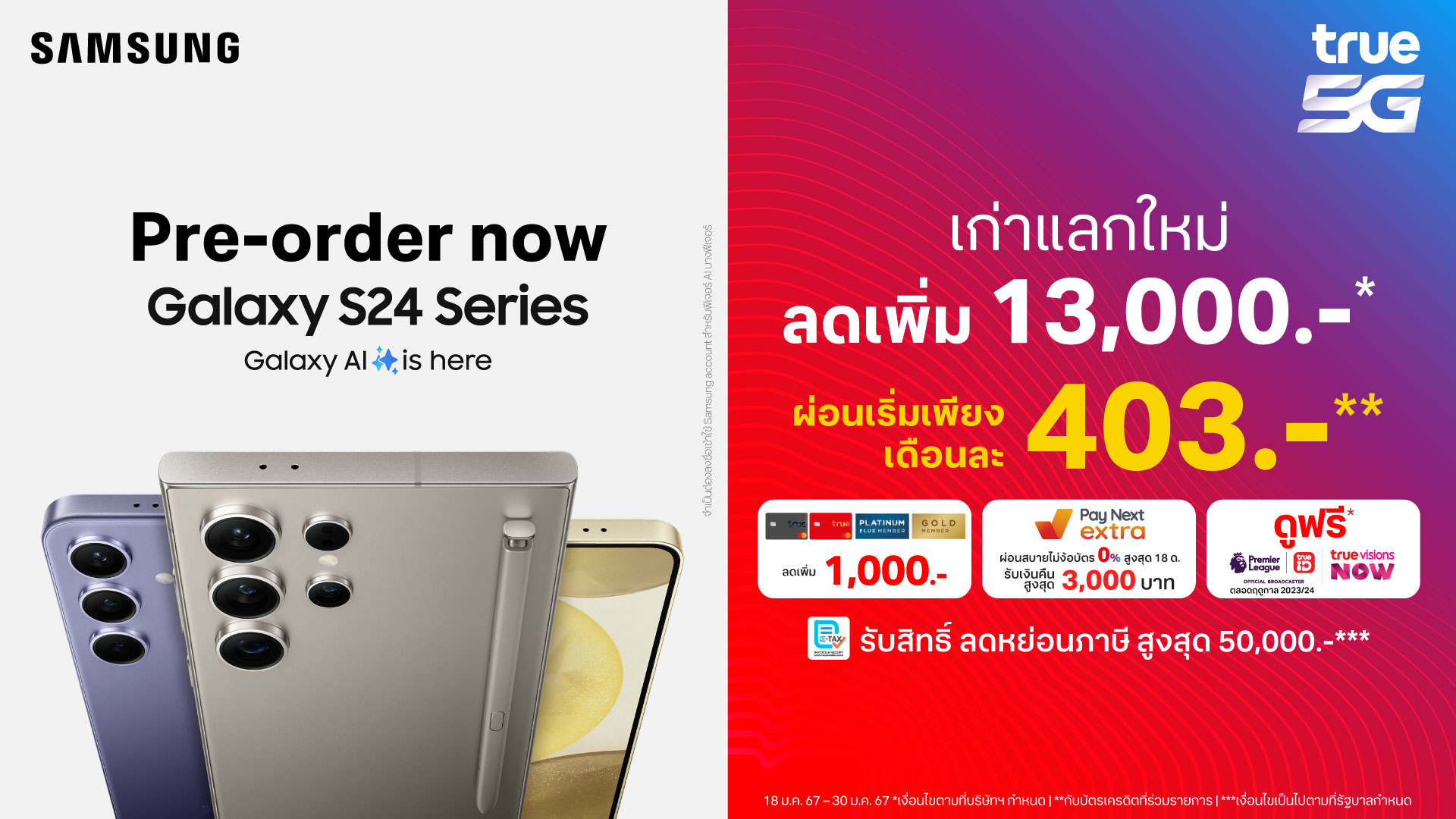 True Corp Launches a Special Campaign “Easy Shopping, Worthwhile Returns” To Support the Government’s Easy E-Receipt Policy. Shop for Smart Phones at True Dtac, Get 4 Benefits, Including Tax Deductions, Unlimited Internet, Convenient Installment without Credit Cards, and Free Access to True Premier League. Available from Today Until February 15, 2024.