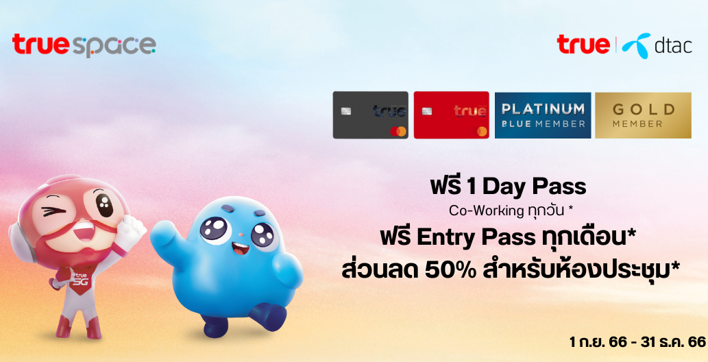 “Happier Together… True Space offers the ultimate exclusive experience, providing better privileges to Dtac customers. Enjoy the unbeatable limitless Co-working Space service, absolutely free! Freedom in every task, limitless creativity. Get it today at True Space, at all branches.”
