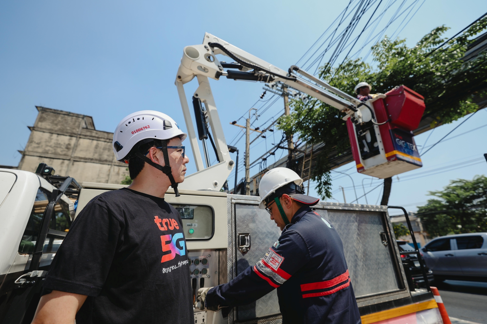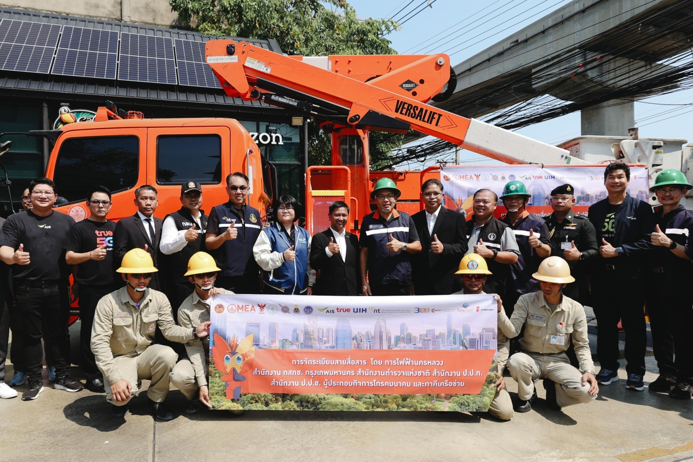29 เมษายน 2569 กรุงเทพฯ ทรู คอร์ปอเรชั่น เดินหน้าสานต่อภารกิจพลิกโฉมกรุงเทพมหานคร ผนึกความร่วมมือกับ การไฟฟ้านครหลวง (MEA) กรุงเทพมหานคร สำนักงาน กสทช. สำนักงานตำรวจแห่งชาติ และพันธมิตร ลุยปฏิบัติการรื้อถอนสายสื่อสารบนเสาไฟฟ้าและนำสายสื่อสารลงใต้ดิน ถนนลาดพร้าว (ตั้งแต่ ถ.รัชดาภิเษก – ถ.ประดิษฐ์มนูธรรม) รวมระยะทางทั้ง 2 ฝั่ง 8.40 กิโลเมตร โดยมี นายราเชนทร์ อันเวช (ที่ 7 จากขวา) รองผู้ว่าการเทคโนโลยีดิจิทัลและระบบสื่อสาร การไฟฟ้านครหลวง (MEA) เป็นประธานในพิธี พร้อมด้วย นายประถมพงศ์ ศรีนวล (ที่ 7 จากซ้าย) ผู้อำนวยการสำนักวิชาการและการจัดการทรัพยากรโทรคมนาคม สำนักงาน กสทช. และ นายกนกศักดิ์ นิ่มนวลรัตน์ (ที่ 2 จากซ้าย) หัวหน้าฝ่ายรัฐกิจและสาธารณูปโภค บมจ.ทรู คอร์ปอเรชั่น ร่วมลงพื้นที่เร่งจัดระเบียบสายสื่อสารให้เป็นไปตามมาตรฐานสากล เพื่อคืนทัศนียภาพที่สวยงาม เสริมความปลอดภัยให้ประชาชน และวางรากฐานสู่การเป็นมหานครอัจฉริยะอย่างเป็นรูปธรรม