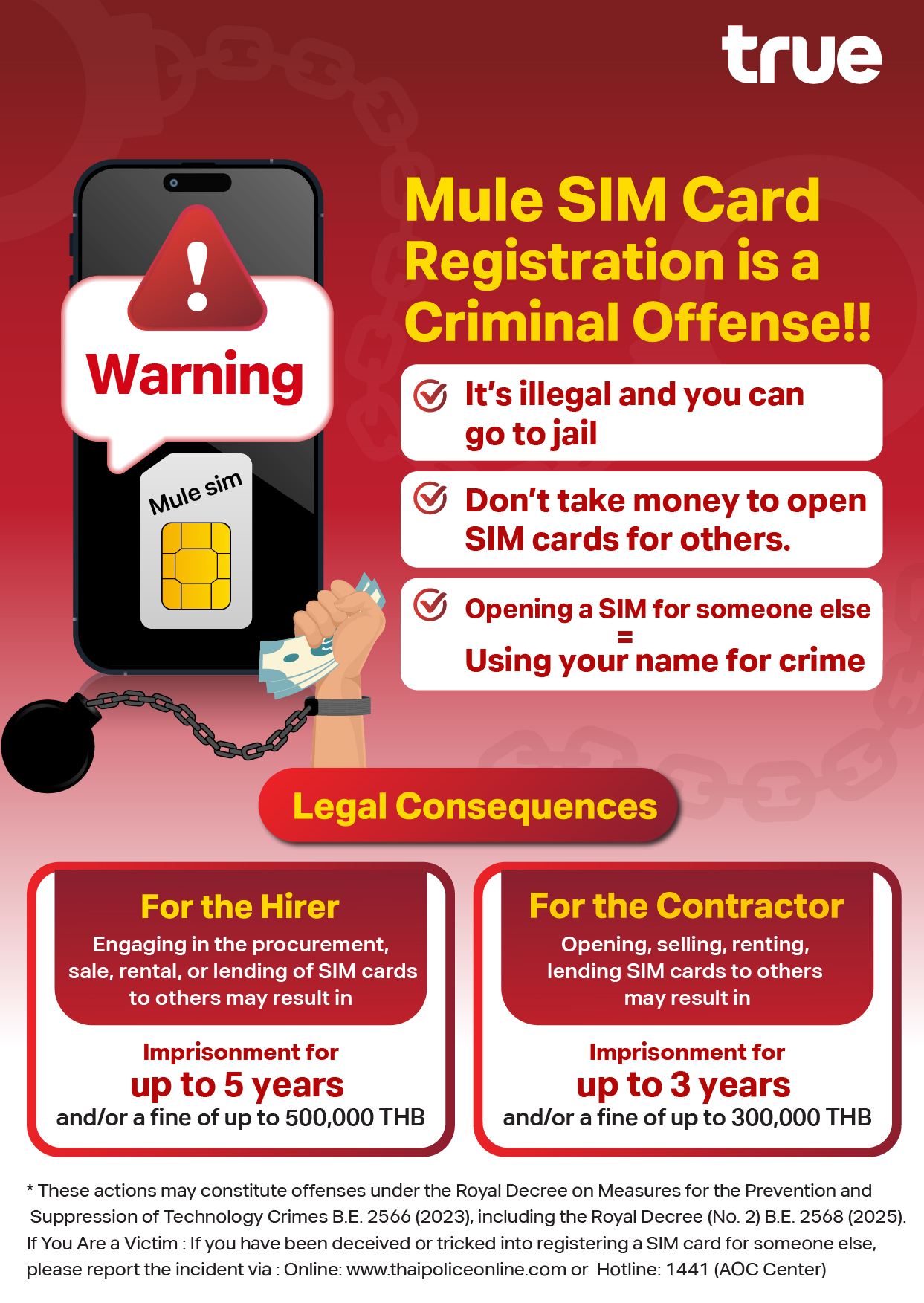 The act of registering, selling, renting, or lending SIM cards on behalf of others may be part of criminal “SIM mule” schemes is strictly prohibited under Thai law.