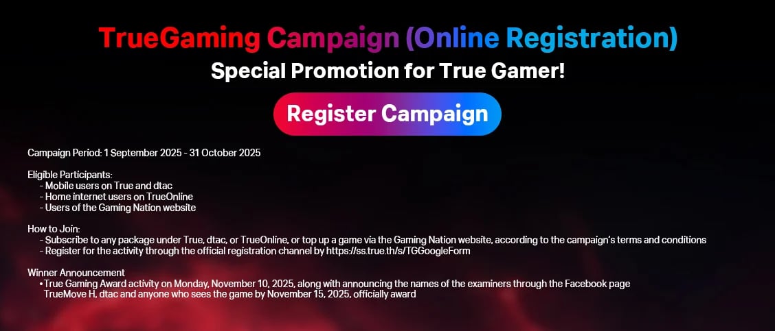 กิจกรรม “True Gaming” นี้สำหรับผู้ใช้บริการของ บริษัท ทรู มูฟ เอช ยูนิเวอร์แซล คอมมิวนิเคชั่น จำกัด และบริษัท ทรู อินเทอร์เน็ต คอร์ปอเรชั่น จำกัด (รวมเรียกว่า “บริษัทฯ”) ซึ่งเป็นผู้ใช้บริการโทรศัพท์เคลื่อนที่ ทรูมูฟ เอช และดีแทคในนามบุคคลธรรมดาทั้งระบบรายเดือน และระบบเติมเงิน ที่มีสถานะของการใช้งานเป็นปกติ (Active Status) (ยกเว้นผู้ใช้บริการในนามนิติบุคคล ตัวแทนเติมเงิน หรือเงื่อนไขอื่นที่บริษัทฯ อาจมีการเปลี่ยนแปลงในภายหลัง) ผู้ใช้บริการของ Gaming Nation และผู้ใช้บริการอินเทอร์เน็ตประจำที่ของทรูออนไลน์ (รวมเรียกว่า “ผู้ใช้บริการ”) โดยผู้ใช้บริการจะต้องสมัครแพ็กเกจหรือบริการภายใต้ ทรูมูฟ เอช, ดีแทค, เติมเงินเกม และทรู ออนไลน์ จากแพ็กเกจและบริการตามเงื่อนไขของการเข้าร่วมกิจกรรม (“ผู้ร่วมกิจกรรม”) กิจกรรมนี้ เริ่มตั้งแต่วันที่ 1 กันยายน 2568 – วันที่ 31 ตุลาคม 2568 เวลา 23.59 น.หรือจนกว่าจะมีการแจ้งเปลี่ยนแปลงจากบริษัทฯ