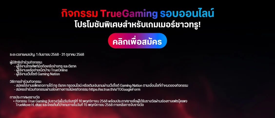 กิจกรรม “True Gaming” นี้สำหรับผู้ใช้บริการของ บริษัท ทรู มูฟ เอช ยูนิเวอร์แซล คอมมิวนิเคชั่น จำกัด และบริษัท ทรู อินเทอร์เน็ต คอร์ปอเรชั่น จำกัด (รวมเรียกว่า “บริษัทฯ”) ซึ่งเป็นผู้ใช้บริการโทรศัพท์เคลื่อนที่ ทรูมูฟ เอช และดีแทคในนามบุคคลธรรมดาทั้งระบบรายเดือน และระบบเติมเงิน ที่มีสถานะของการใช้งานเป็นปกติ (Active Status) (ยกเว้นผู้ใช้บริการในนามนิติบุคคล ตัวแทนเติมเงิน หรือเงื่อนไขอื่นที่บริษัทฯ อาจมีการเปลี่ยนแปลงในภายหลัง) ผู้ใช้บริการของ Gaming Nation และผู้ใช้บริการอินเทอร์เน็ตประจำที่ของทรูออนไลน์ (รวมเรียกว่า “ผู้ใช้บริการ”) โดยผู้ใช้บริการจะต้องสมัครแพ็กเกจหรือบริการภายใต้ ทรูมูฟ เอช, ดีแทค, เติมเงินเกม และทรู ออนไลน์ จากแพ็กเกจและบริการตามเงื่อนไขของการเข้าร่วมกิจกรรม (“ผู้ร่วมกิจกรรม”) กิจกรรมนี้ เริ่มตั้งแต่วันที่ 1 กันยายน 2568 – วันที่ 31 ตุลาคม 2568 เวลา 23.59 น.หรือจนกว่าจะมีการแจ้งเปลี่ยนแปลงจากบริษัทฯ