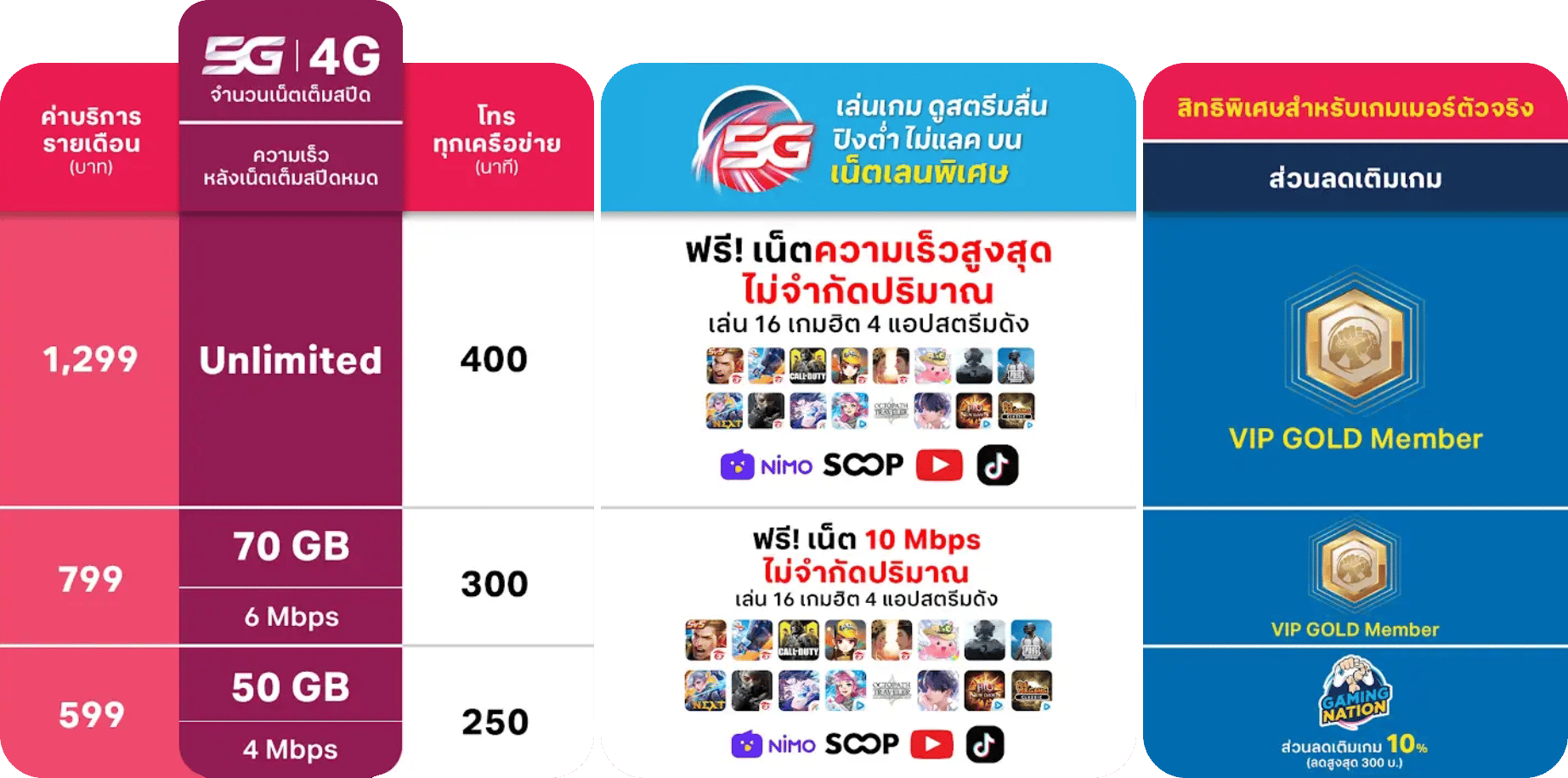 - ผู้ใช้บริการแพ็กเกจ 5G Super Gamer 799 - 1299 สามารถรับโค้ดสมาชิก เพื่อนำไปใช้สมัครสมาชิก Gaming Nation VIP ระดับ Gold Member จำนวน 1 ครั้ง/เดือน เมื่อลงทะเบียนรับสิทธิสำเร็จและชำระค่าบริการรายเดือนมือถือต่อเนื่อง