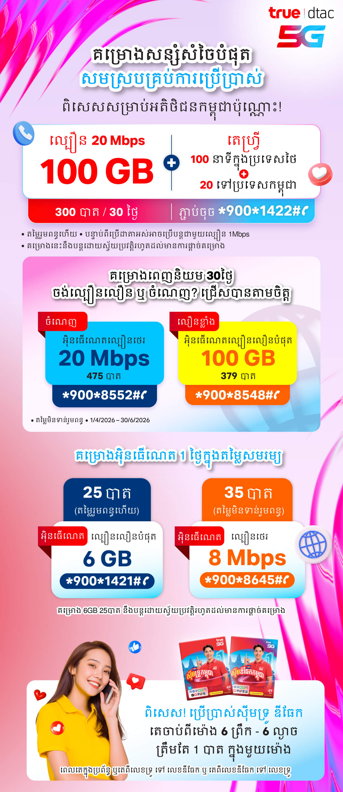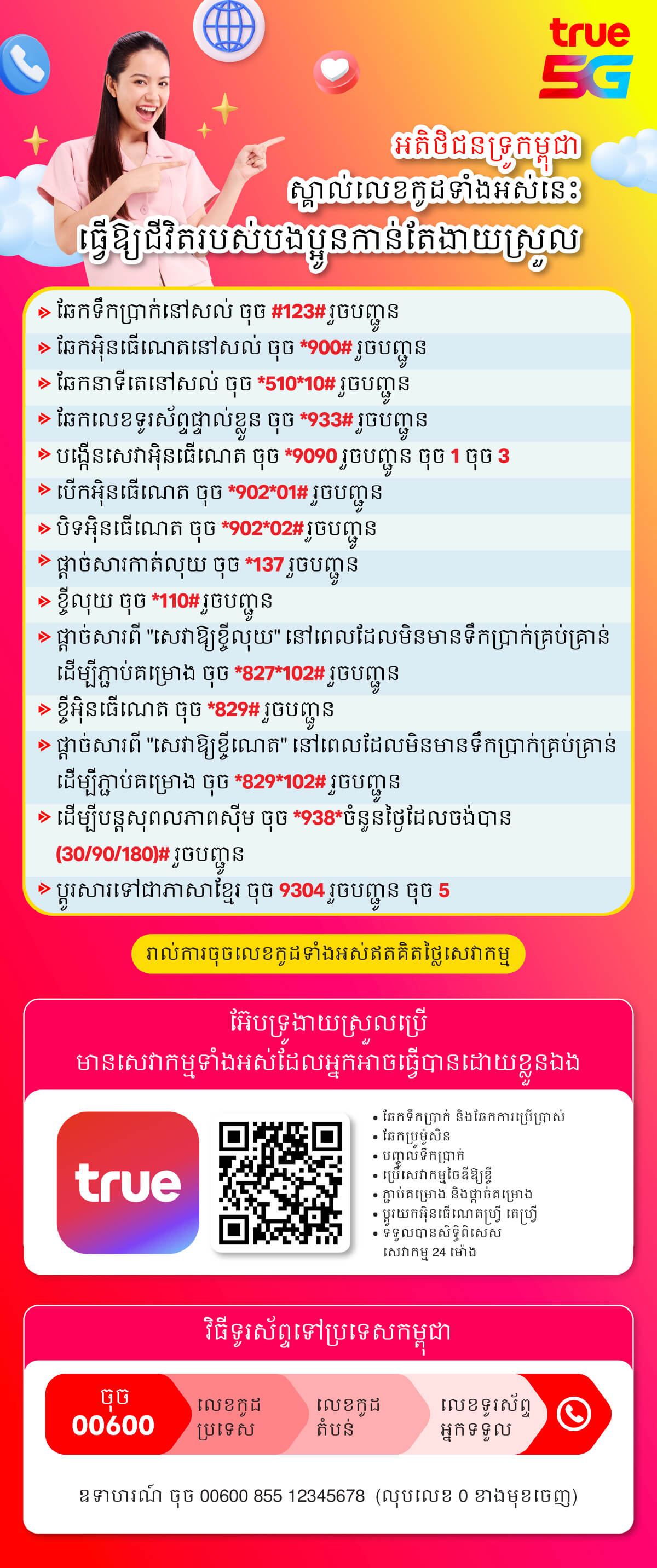True 5G USSD កម្ពុជា: ឆែកលុយ, បើក/បិទអុិនធឺណិត, សុំលុយអីុយម