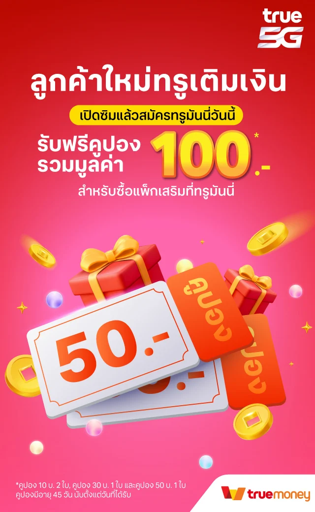 ลูกค้าใหม่ทรูเติมเงิน สมัครทรูมันนี่ รับฟรีคูปอง รวมมูลค่า 100 บาท