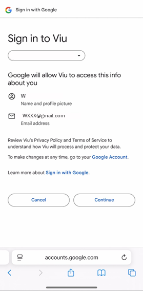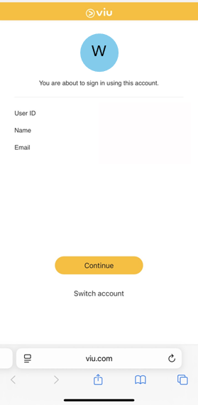 แสดงข้อมูลบัญชี Viu กด Continue เพื่อยืนยัน