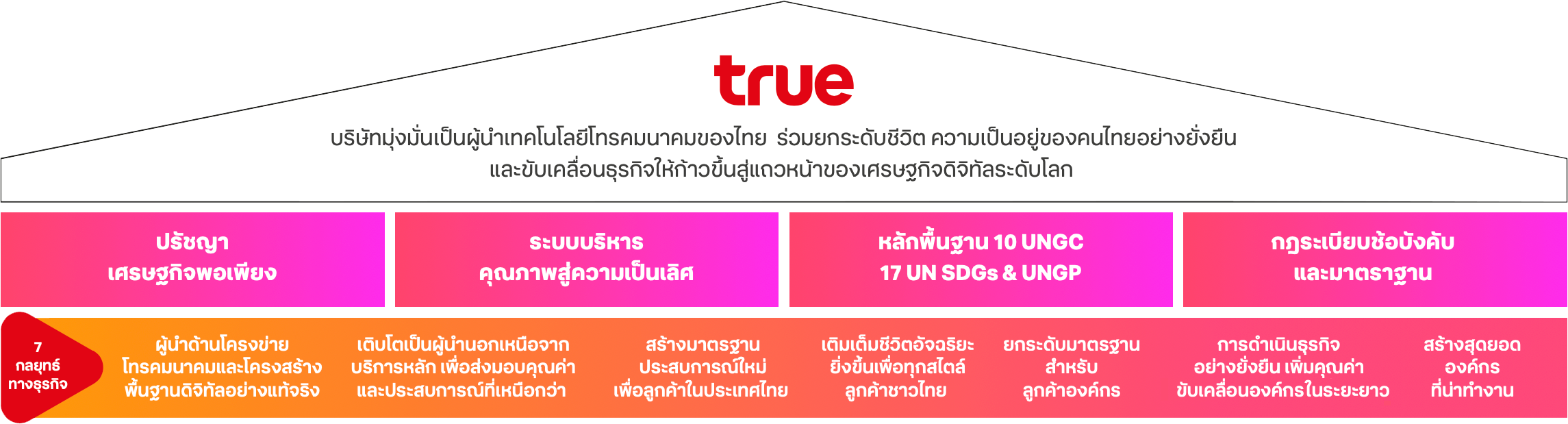“ทรู คอร์ปอเรชั่นพัฒนาคุณภาพชีวิตด้วยนวัตกรรมดิจิทัล ซึ่งสิ่งนี้ ต้องอาศัยความไว้วางใจจากทุกภาคส่วน เรามุ่งมั่นที่จะนำเป้าหมาย การพัฒนาที่ยั่งยืนของสหประชาชาติ (SDGs) และน้อมนำหลัก ปรัชญาเศรษฐกิจพอเพียง มาเป็นหลักการสำคัญในการขับเคลื่อน การพัฒนาธุรกิจ ด้วยเหตุนี้ ทรูจึงยึดมั่นในมาตรฐานสากลด้าน ธรรมาภิบาลที่ดี และดำเนินโครงการขนาดใหญ่เพื่อส่งเสริมการ เข้าถึงดิจิทัลในประเทศไทย”
