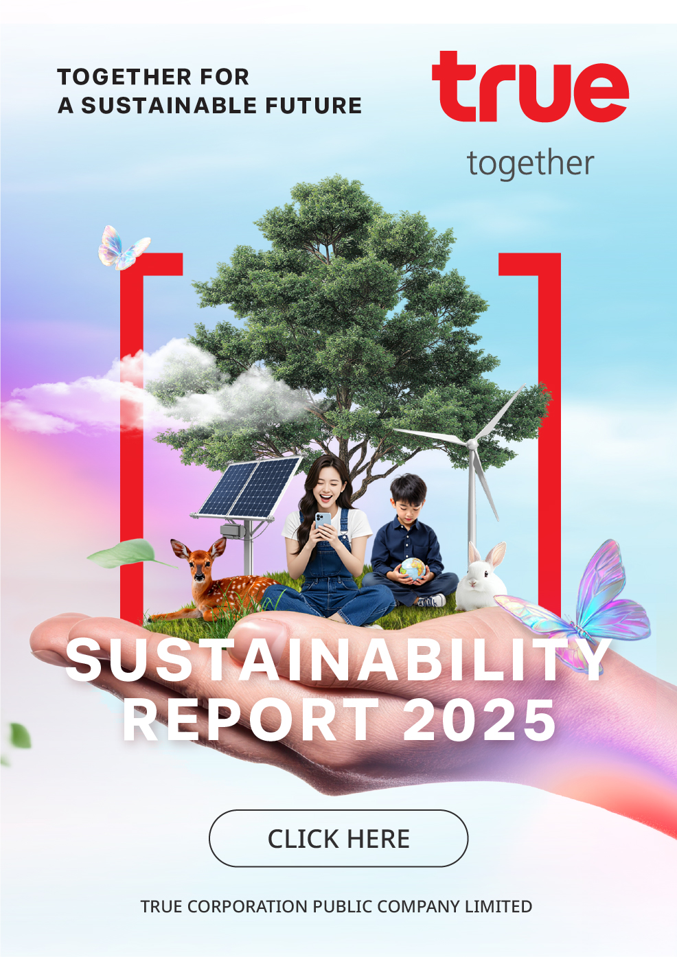 “ในฐานะบริษัทเทคโนโลยีโทรคมนาคมชั้นนำที่ให้ความสำคัญกับความยั่งยืน ทรู คอร์ปอเรชั่นมุ่งมั่นดำเนินการอย่างครบวงจรเพื่อความยั่งยืน ตั้งแต่การ ขับเคลื่อนนวัตกรรม 5G การส่งเสริมปัญญาประดิษฐ์ที่มีจริยธรรม การสร้าง ความเท่าเทียมทางดิจิทัล ไปจนถึงการดำเนินมาตรการด้านสภาพภูมิอากาศ ด้วยความมุ่งมั่นเหล่านี้ เราไม่เพียงแต่กำหนดมาตรฐานในอุตสาหกรรม เท่านั้น แต่ยังส่งเสริมความร่วมมือจากพนักงานและผู้มีส่วนได้ส่วนเสียทุก ฝ่าย เพื่อสร้างอนาคตดิจิทัลที่ยั่งยืนสำหรับประเทศไทย”